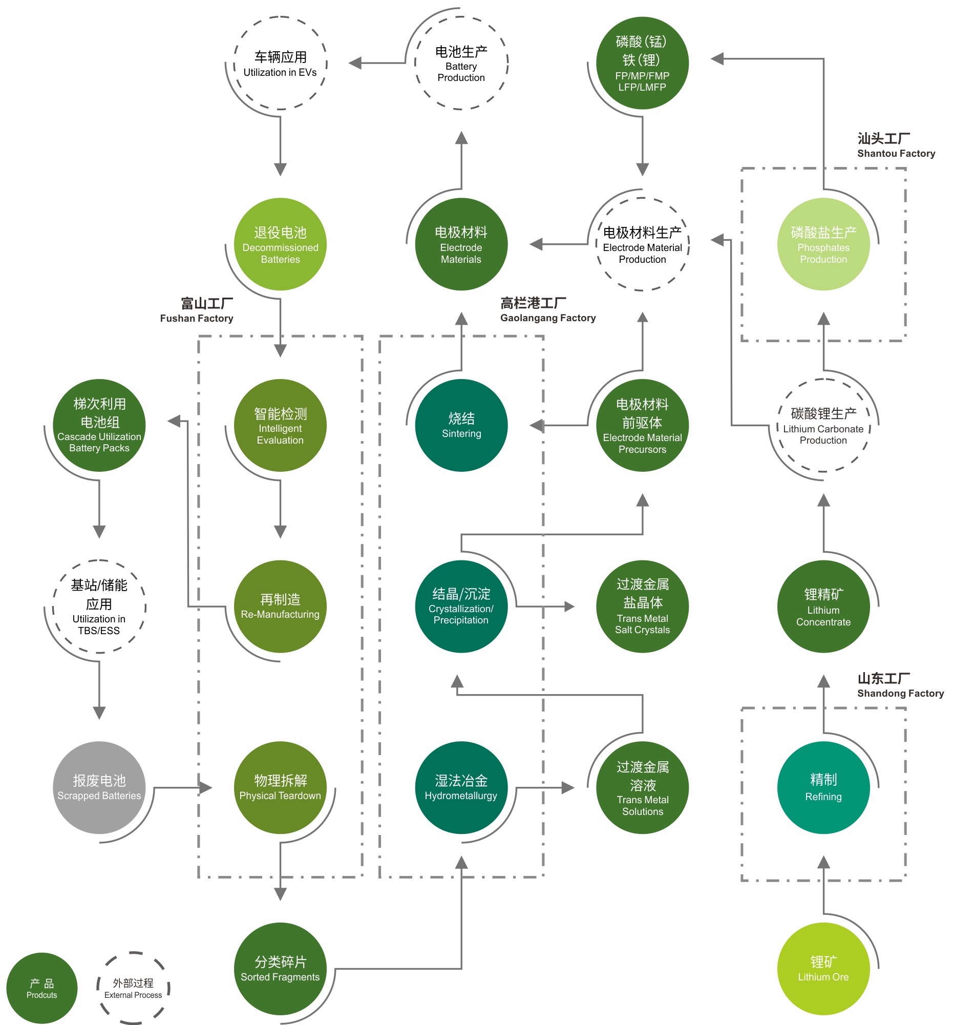 GHTECH masters the technology and engineering capability for the whole value chain of “traction battery cascade utilization - disassembly & classification - material repair - valuable metal recycling - material manufacturing”, and provides customers overall service for the full life cycle of retired traction batteries.