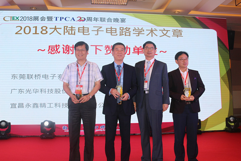 白天的展覽結束后, CTEX2018展會暨TPCA 20周年聯合晚宴正式拉開帷幕。TPCA理事長吳永輝先生首先致辭,并為光華科技等贊助商感謝致贈。