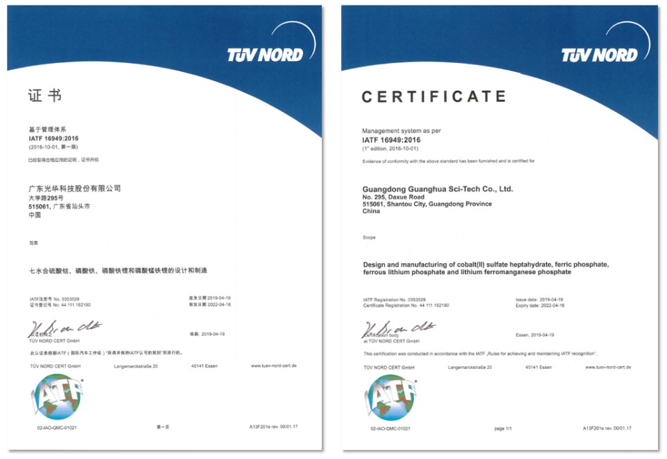 目前,經(jīng)過不懈努力,公司的七水合硫酸鈷、磷酸鐵、磷酸鐵鋰和磷酸錳鐵鋰近日順利通過了IATF16949:2016認(rèn)證,這意味著上述產(chǎn)品的設(shè)計(jì)及制造達(dá)到汽車行業(yè)質(zhì)量管理的先進(jìn)水平,產(chǎn)品品質(zhì)更加穩(wěn)定可靠。