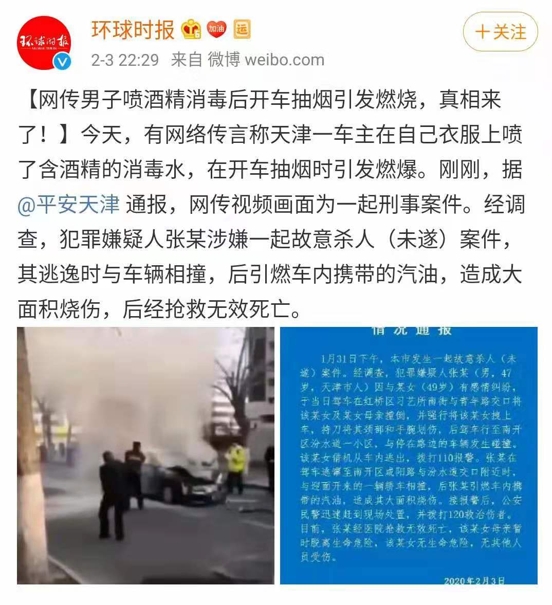 網上有傳言:天津南開區汾水道一車主因噴75%酒精濃度的消毒水,抽煙時不小心自燃,引發命案。無獨有偶,2月3日上午,武漢市硚口長風路一居民樓起火,有傳言稱起火原因是居民用高濃度酒精室內消毒。