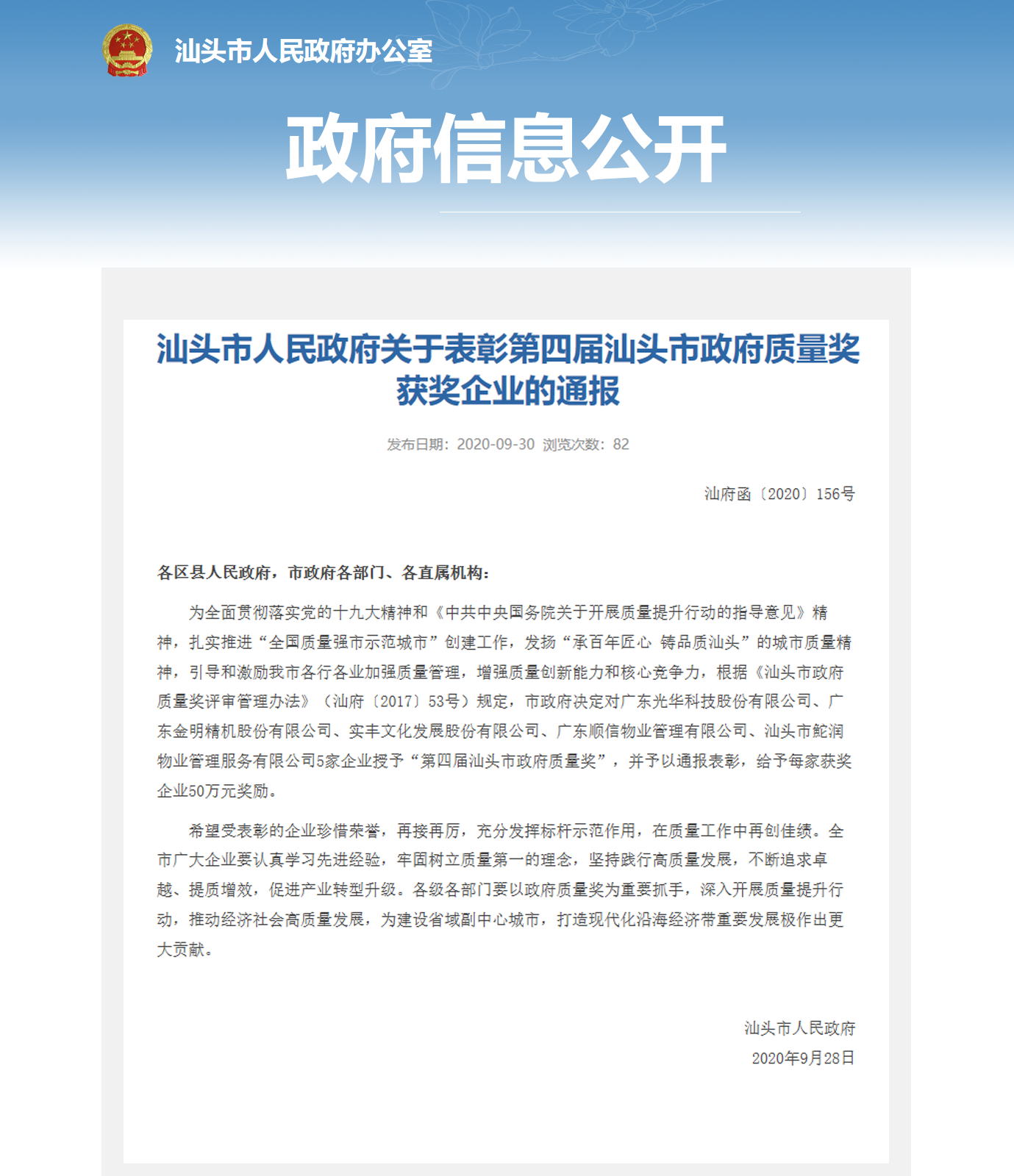 汕頭市政府質(zhì)量獎(jiǎng)是汕頭市人民政府設(shè)立的最高質(zhì)量獎(jiǎng)項(xiàng),主要參照全國(guó)質(zhì)量獎(jiǎng)評(píng)獎(jiǎng)標(biāo)準(zhǔn)GB/T19580《卓越績(jī)效評(píng)價(jià)準(zhǔn)則》,每?jī)赡暝u(píng)選一屆,堅(jiān)持“高標(biāo)準(zhǔn)、嚴(yán)要求、好中選優(yōu)”的評(píng)審原則,選出對(duì)質(zhì)量管理成效顯著,產(chǎn)品、服務(wù)和經(jīng)營(yíng)質(zhì)量、自主創(chuàng)新能力和市場(chǎng)競(jìng)爭(zhēng)力等同行業(yè)內(nèi)處于領(lǐng)先地位,以及對(duì)地方經(jīng)濟(jì)社會(huì)發(fā)展作出卓越貢獻(xiàn)的企業(yè)。每屆獲獎(jiǎng)企業(yè)或組織數(shù)量不多于五家。此獎(jiǎng)項(xiàng)對(duì)樹立行業(yè)標(biāo)桿企業(yè),激勵(lì)各行各業(yè)提質(zhì)增效,對(duì)社會(huì)經(jīng)濟(jì)高質(zhì)發(fā)展具有極大推動(dòng)作用。