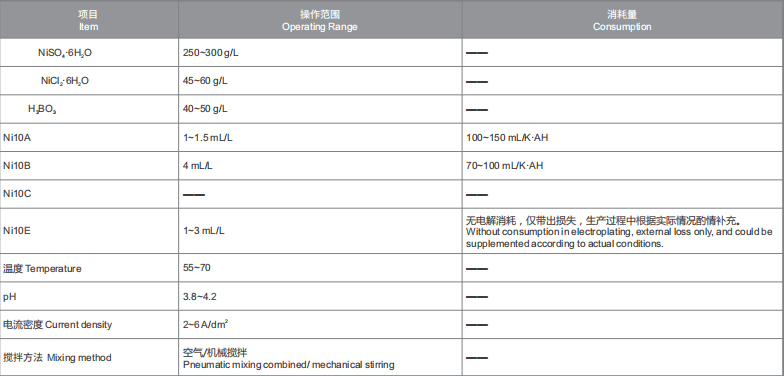 Ni10A: Commonly known as brightener. It iIt controls brightness and leveling up of plating as well as potential difference through combined action with make-up agent Ni10B. Its concentration can be controlled through visual inspection of plating articles’ appearance or by measuring potential difference. When Ni10A is insufficient, brightness and leveling ability of plating articles are bad and potential difference is slightly lower; when Ni10A is excessive, potential difference is slightly higher and appearance of plating articles is bright. In severe cases, flexibility of plating decreases and even missing plating happens in the low current density region. Excessive Ni10A can only be consumed by electrolysis;