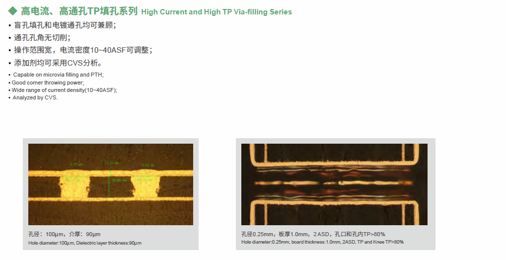 VFP series is a new generation of via-filling solution which also apply to VCP equipment, with high speed blind hole filling capacity suitable for hole diameter of 2~6mil and thinner surface copper, it’s fully applied for the production of fine lines, high current, high through hole plating, as well as simultaneously through hole and blind hole plating meanwhile through hole have good corner throwing power.